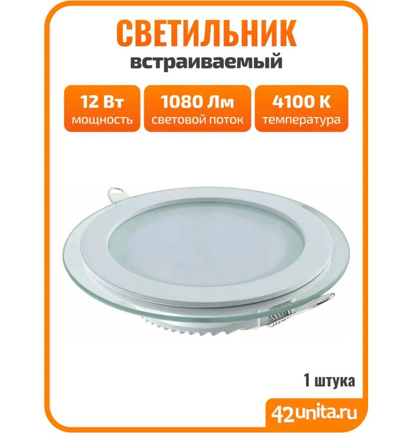 Встраиваемый светильник, LED панель круглая стекло 12Вт 4100К