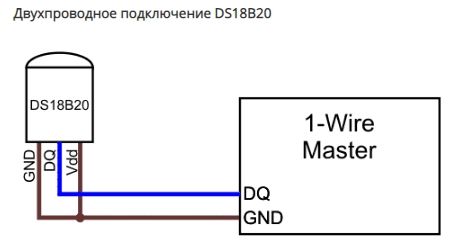 Датчик предназначен для двухпроводного подключения. При двухпроводном подключении, ведущее устройство должно обеспечивать "паразитное" питание по шине данных.