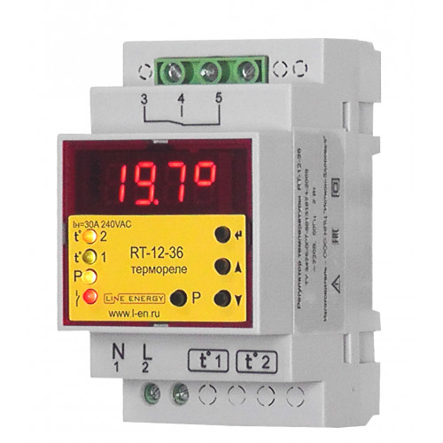 Реле температуры, (термореле или терморегулятор) с контролем температуры в двух зонах и с недельным таймером RT-12-36  предназначено для контроля и поддержания температурного режима путем включения/выключения нагревающей установки по сигналам двух выносных датчиков температуры, в соответствии с заданной температурой в установленные часы и дни. Имеет недельный таймер, с возможностью установки разных температур на разные диапазоны времени. Применяетьс ;для управления работой отопительной системы. Имеет два выносных датчика и одну группу контактов 30А.