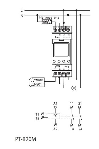 • РТ-820М имеет выходной контакт аварийной сигнализации, срабатывающий при повышении/падении температуры более/менее установленного значения.