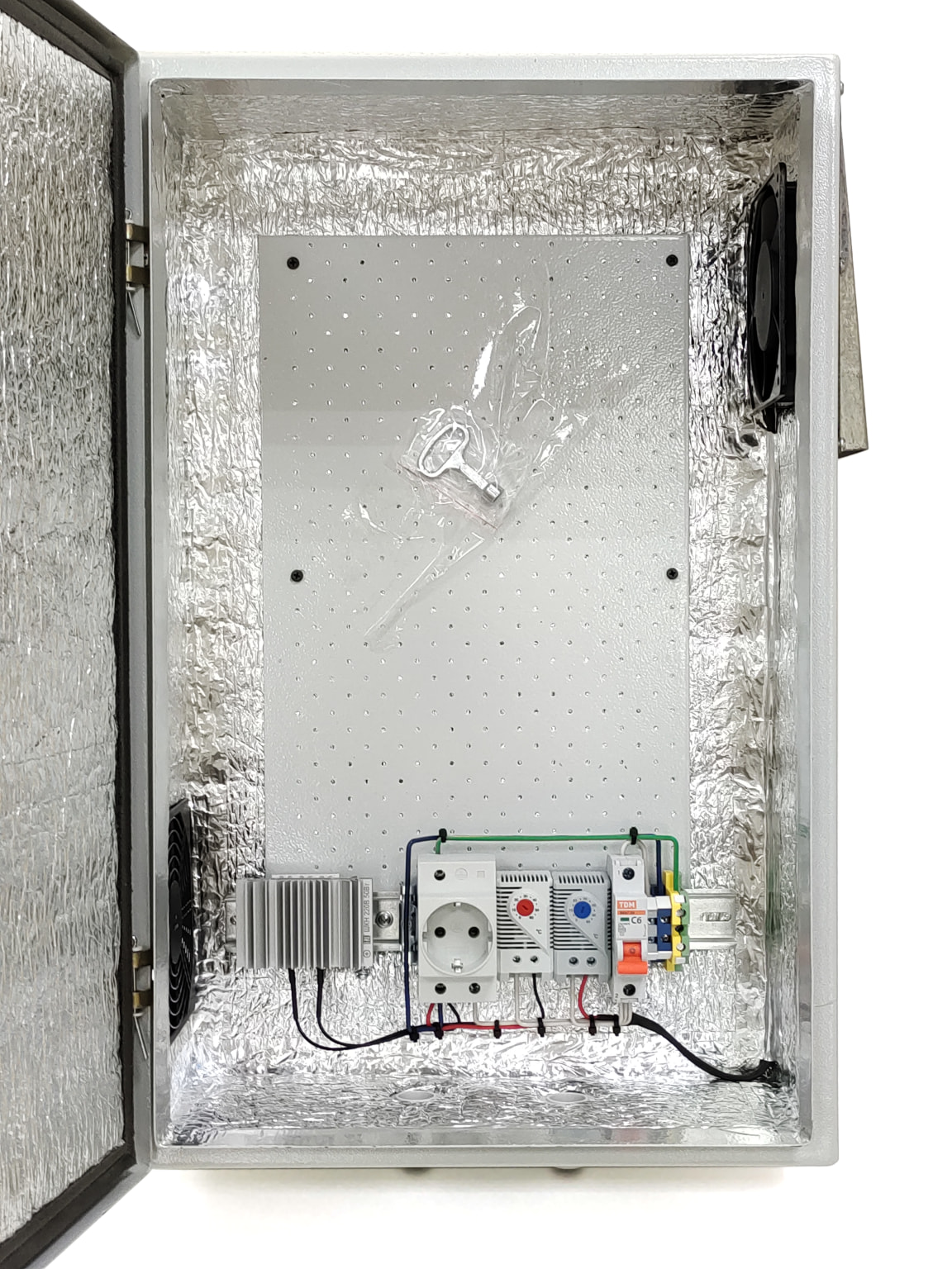 Конструктивно термошкаф состоит из металлического шкафа с установленным оборудованием. Поддержание заданной температуры осуществляется механическими биметаллическими терморегуляторами, которые расположены на DIN рейке внизу.