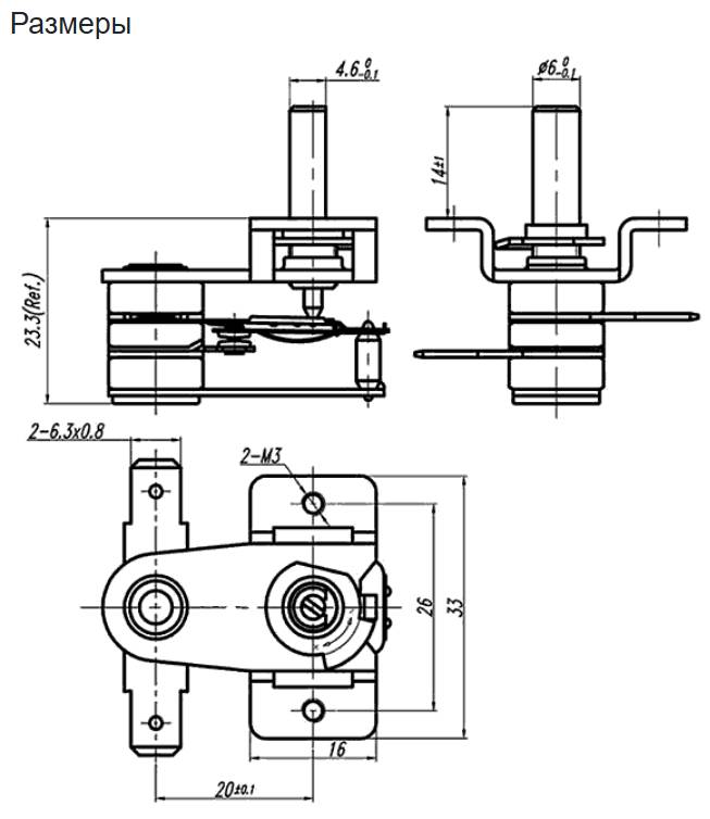 Температура размыкания контакта при максимальном угле поворота вала 250±10°С