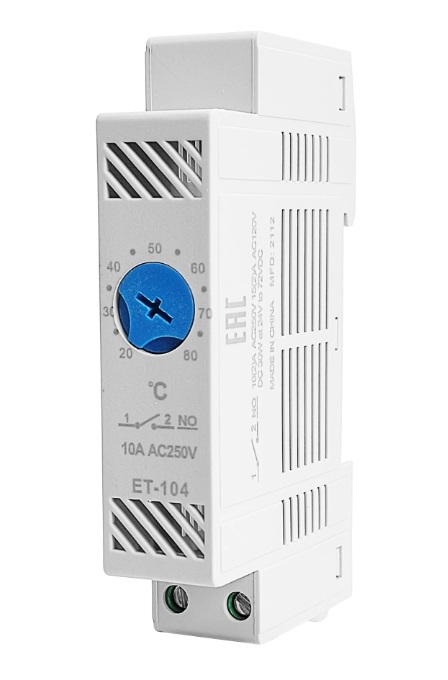 Термостат для шкафа автоматики ET-104 с диапазоном регулирования от +20°C до +80°C предназначен для замыкания силовой электрической цепи при заданной температуре. Термостат не имеет собственного электропотребления.