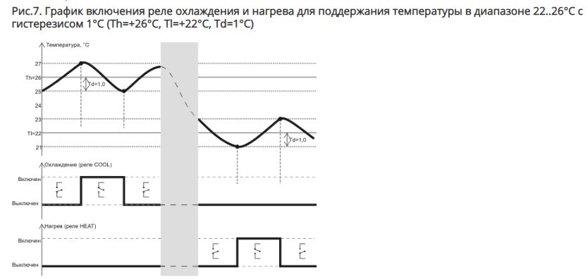 Терморегулятор включает реле нагрева или охлаждения при выходе температуры за заданные пределы температуры с учетом гистерезиса (примеры на рис.5, рис. 6, рис. 7).