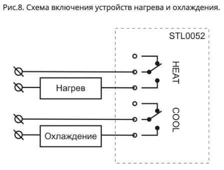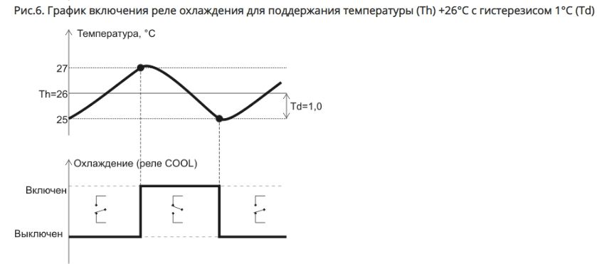 Реле охлаждения (COOL) включается при T≥Tl+Td, выключается при T≤Tl-Td.