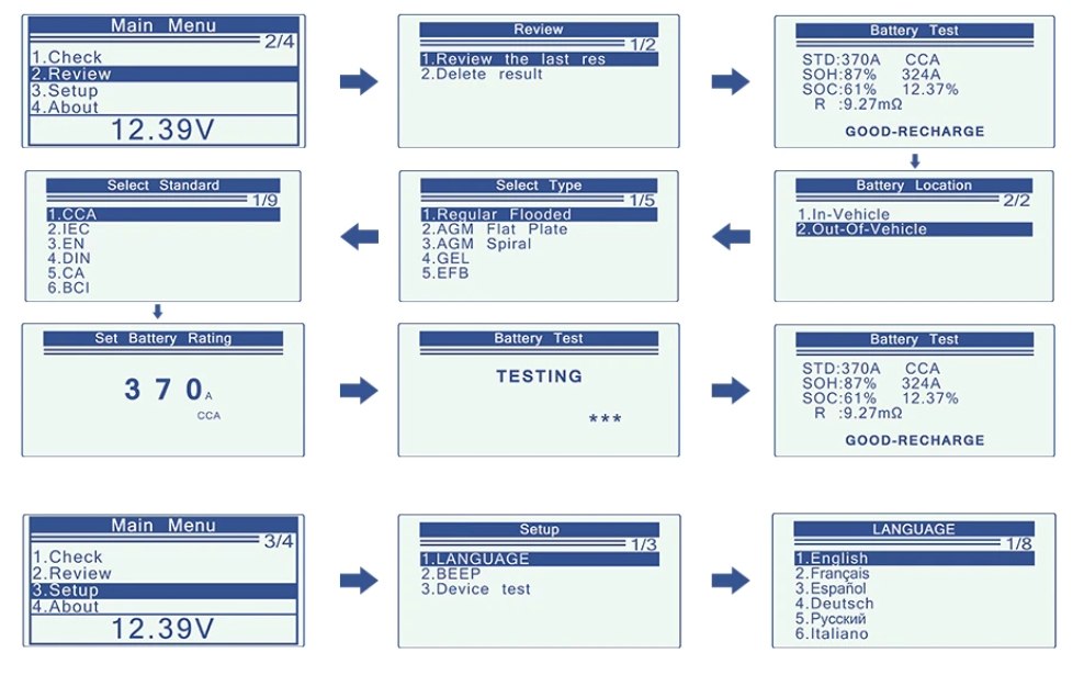 Данный тестер АКБ для диагностики автомобильных аккумуляторов с номинальным напряжением 12 Вольт. Тестирует все автомобильные 12В свинцово-кислотные аккумуляторы, в том числе: стандартные, AGM (плоские и спиральные), заливные, гелевые, VRLA, обслуживаемые и не обслуживаемые.