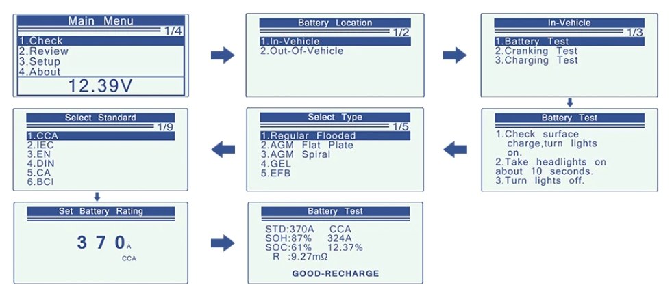 Оцениваются состояние АКБ, такие как: заряженность, пусковой ток, процент амортизации, так и пусковая и зарядная электро-системы автомобиля. При этом тесты проводятся без нагрузки, поэтому не могут повредить аккумулятору, а результаты отличаются постоянством.