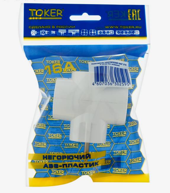 Разветвитель (тройник) 3 роз. 16А, без заземлен, белый (T-образный) негорючий ABS-пластик TOKER 3T16 Распродажа Хит продаж