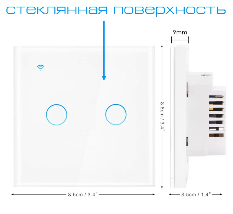 Устройство имеет стеклянную сенсорную панель с приятной светодиодной подсветкой, с помощью которой выключатель легко найти в темноте чтобы включить свет. Управлять включением и выключением света можно разными способами: Вручную касанием, вручную удаленно с помощью приложения, по расписанию или по таймеру в настройках приложения. Также возможно голосовое управление Яндекс Алисой, Amazon Alexa или Google Assistant.