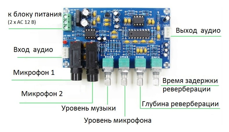 За эффекты реверберации отвечает микросхема – звуковой процессор PT2399 от Princeton Technology Corp. В данном случае, эффект реверберации достигается путем разделения входного аудио сигнала, задержки одной части и обратного суммирования сигналов. Усилитель позволяет регулировать параметры эффектов - глубину и время реверберации.