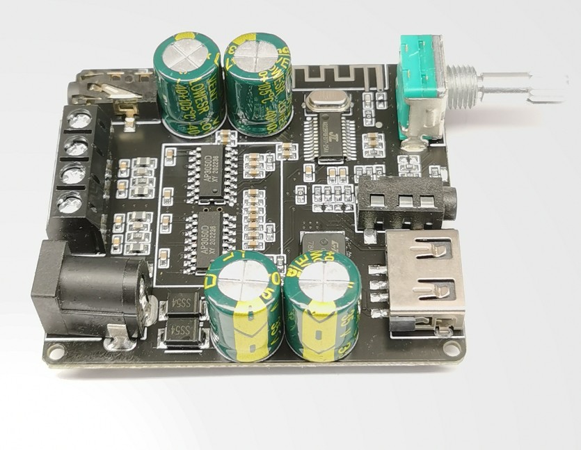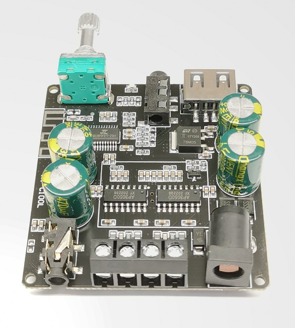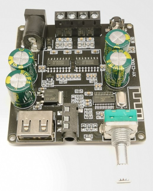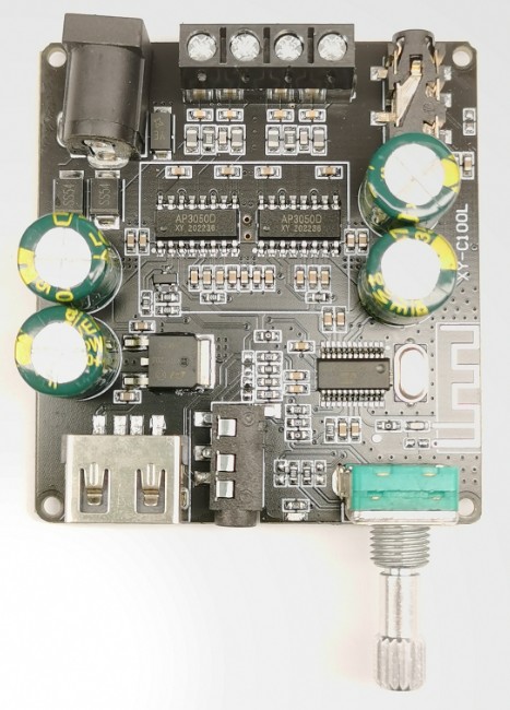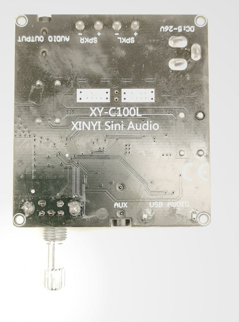 Качественный и мощный аудиоусилитель Sinilink XY-C100L на основе микросхемы AP3050D. Оснащен потенциометром с выключателем для регулировки громкости и отключения усилителя.