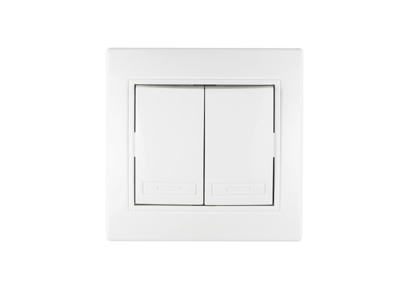 Выключатель двухклавишный скрытой проводки, цвет – белый. Тип зажимов винтовой; Степень защиты IP-20; Напряжение в сети 220/250 В; Частота тока 50 Г; Номинальный ток 10 А; Материал корпуса АБС-пластик; Материал деталей контактных групп латунь; Сечение присоединяемых к контактам проводов от 0,1 до 2,5 мм2;