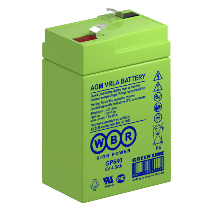 Аккумулятор WBR GP640 - герметизированная, выполненная по технологии AGM, аккумуляторная батарея общего применения со сроком службы до 8 лет в буферном режиме или 260 циклов заряда-разряда в циклическом режиме при 100% разряде. Высокоэффективная перезаряжаемая батарея, не требующая обслуживания в течение всего срока службы.