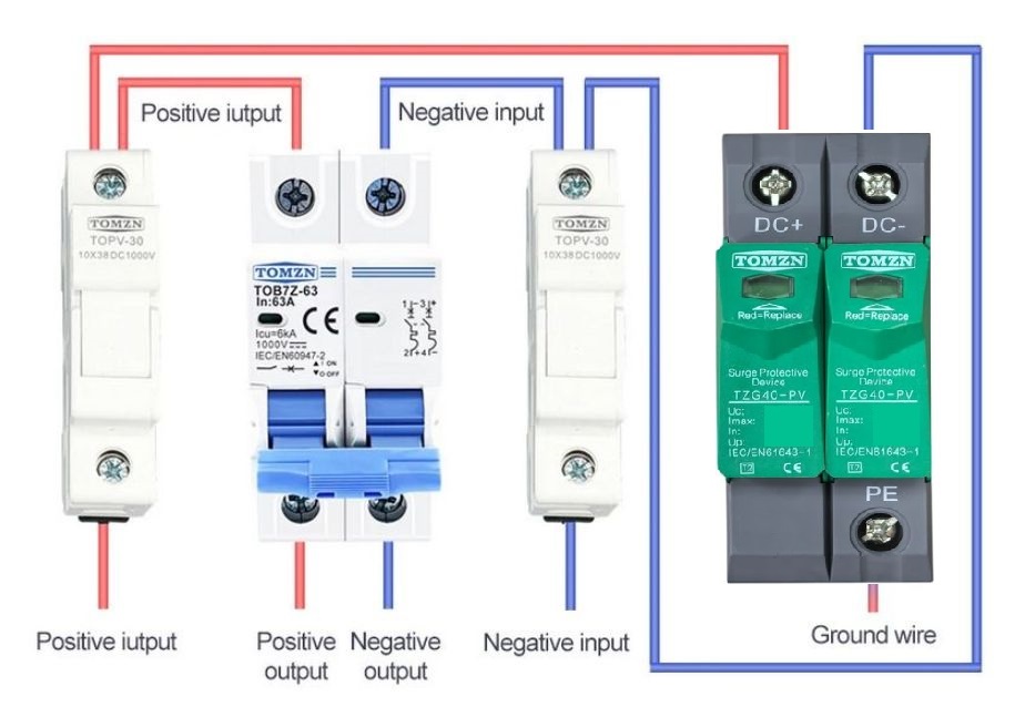 Данные устройства устанавливаются в сетях постоянного тока параллельно проводу от солнечных батарей до инвертора напряжения. Для работы УЗИП обязательно наличие заземляющего контура. УЗИП необходимо устанавливать в двух точках, если длина проводов от панелей до инвертора/контроллера составляет более 10 метров: один в непосредственной близости от солнечных панелей, второй - в распределительном щитке перед инвертором.