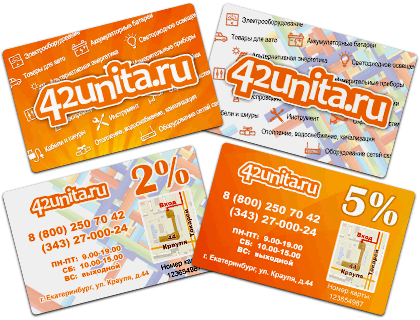 Уважаемые покупатели! Нашим постоянным покупателям (физическим лицам) мы предоставляем дисконтные (скидочные) карты магазина 42unita.ru, чтобы Вам было легко и удобно получать скидки при оформлении заказа на сайте, а также при совершении покупки непосредственно в магазине!