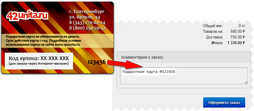 • Для получения скидки при заказе через интернет-магазин 42unita.ru номер вашей карты необходимо ввести в поле Код купона при оформлении заказа, как показано на картинке ниже.